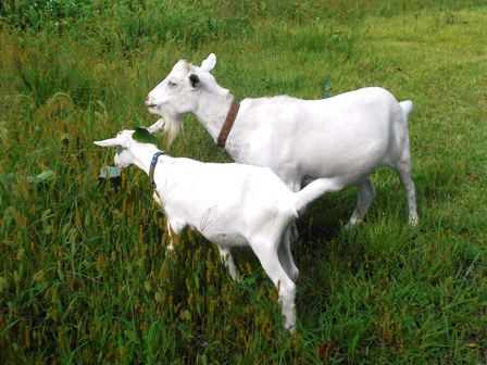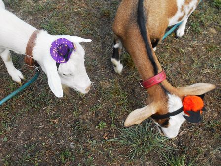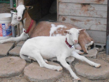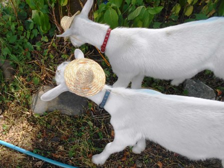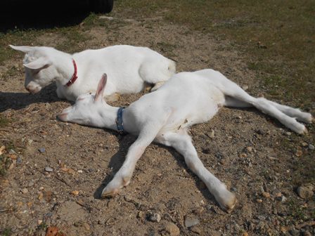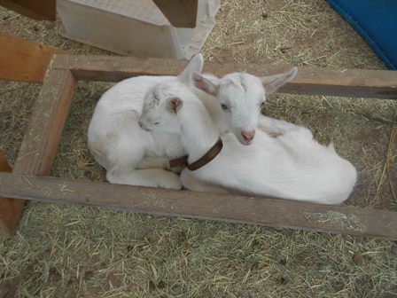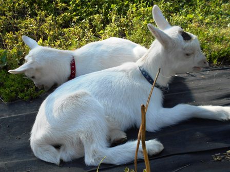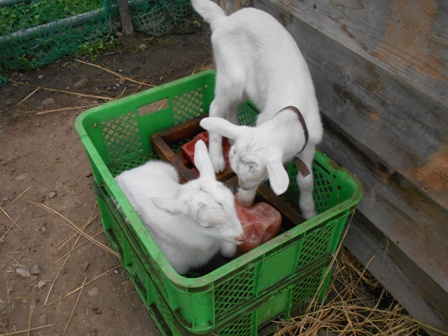 先週生まれた2頭の子ヤギたち。おっぱいも2頭同時に上手に飲めるようになりました。