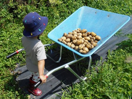 5月に植えたジャガイモの葉が枯れてきて、掘り頃になったようなので、芋掘りをしました。