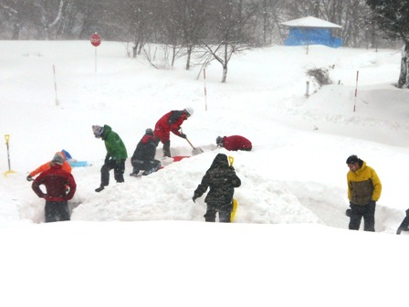 早朝、まずはお父さんたちが到着し、休む間もなく、早速かまくら作りを開始。