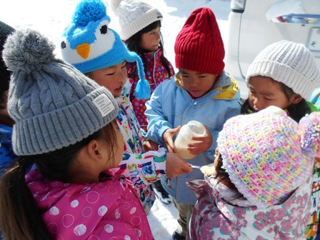アイスクリームの材料をビンに入れて雪に埋めて凍らせます